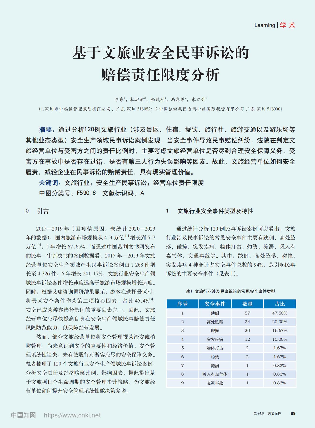 通过分析120例文旅行业(涉及景区、住宿、餐饮、旅行社、旅游交通以及游乐场等其他业态类型)安全生产领域民事诉讼案例发现,当安全事件导致民事赔偿纠纷,法院在判定文旅经营单位与受害方之间的责任比例时,主要考虑文旅经营单位是否尽到合理安全保障义务,受害方在事故中是否存在过错,是否有第三人行为失误影响等因素。故此,文旅经营单位如何安全履责,减轻企业在民事诉讼的赔偿责任,具有现实管理价值。