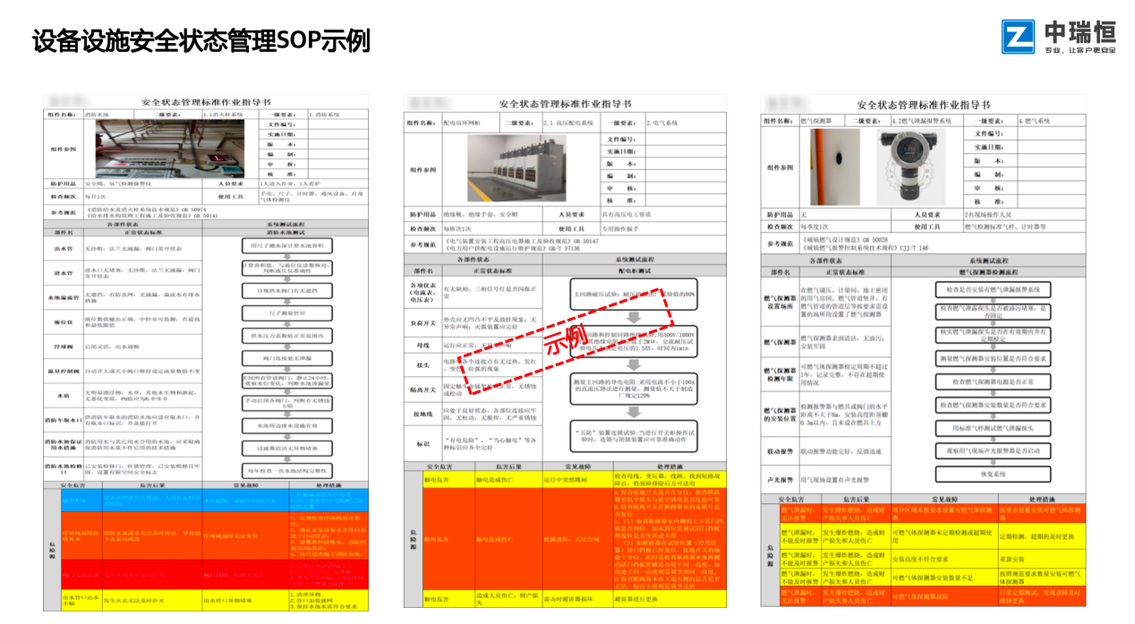 商业/酒店板块设备设施SOP按照设备设施系统分类包含消防、电气、电梯、燃气等10个系统共计181份设备设施安全状态管理SOP,明确了设备设施组部件安全状态标准、测试程序、危险源及管控措施等,为一线员工提供具体、明确的设备设施安全标准。