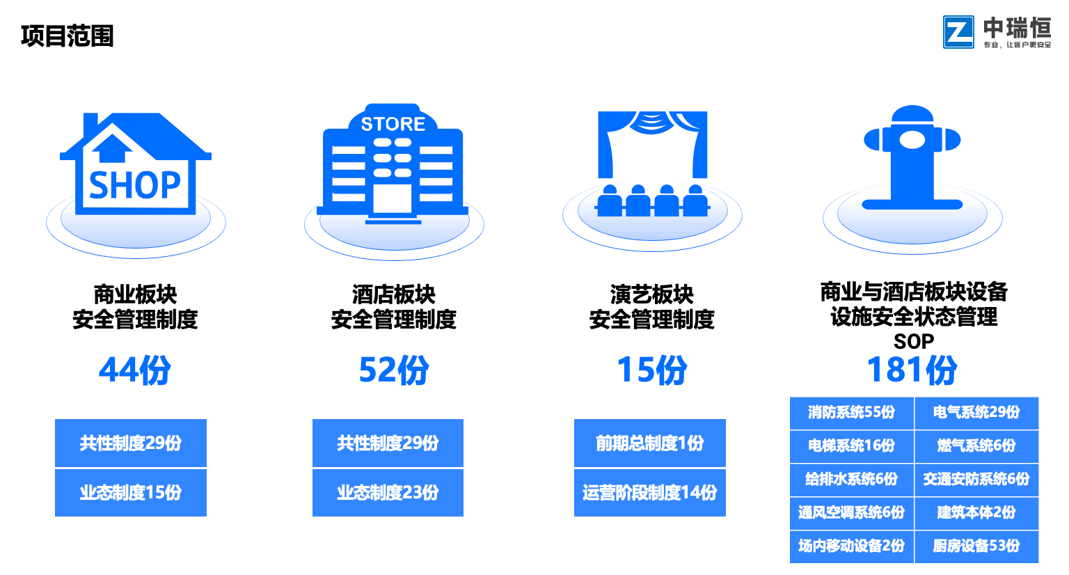 项目成果包含商业板块安全管理制度44份,酒店板块安全管理制度52份,演艺板块安全管理制度15份,商业/酒店板块10个设备设施系统合计SOP181份。