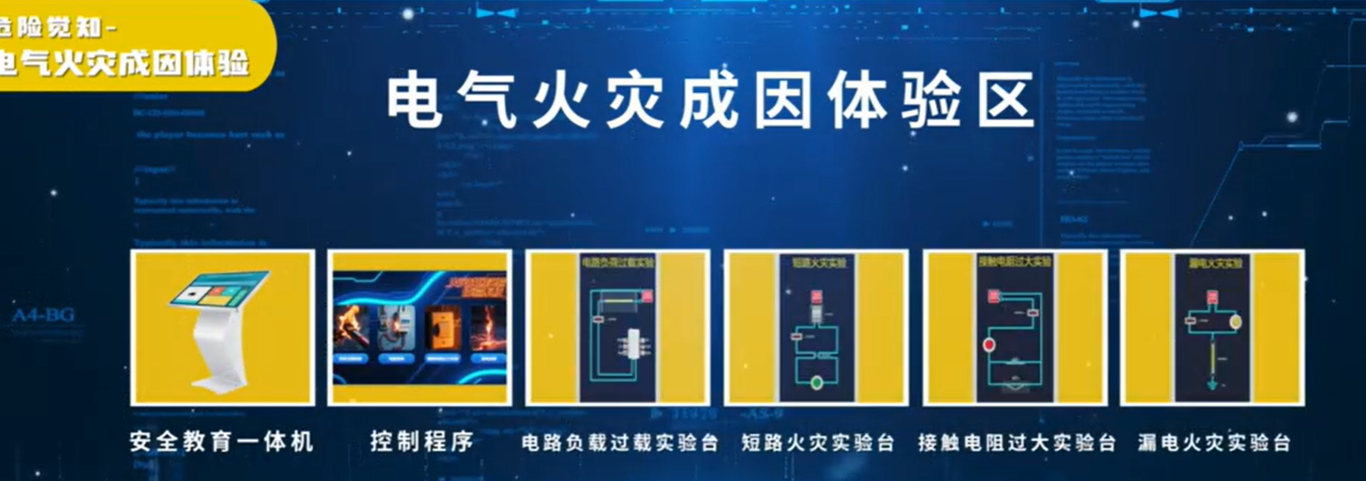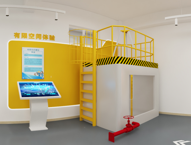 该安全示范基地以价值认知、危险觉知和安全护卫为设计主线,涵盖了宣传区和劳保用品体验区、灭火体验区、VR体验区、燃气爆炸体验区、电气火灾成因体验区、有限空间作业体验区和触电解救体验区等体验项目。